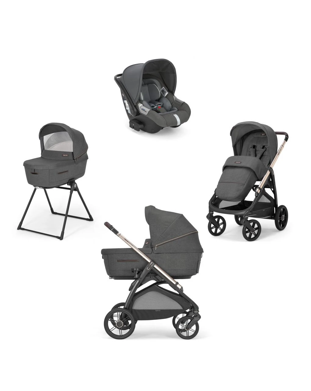 Comprende: culla, Welcome Pad™ e materassino, Standup, seduta passeggino, coprigambe per passeggino, telaio, cestino porta oggetti, porta bibite e seggiolino auto Cab 0+, omologato secondo il regolamento ECE R44/04 per il gruppo 0+ (da 0 a 13 kg).