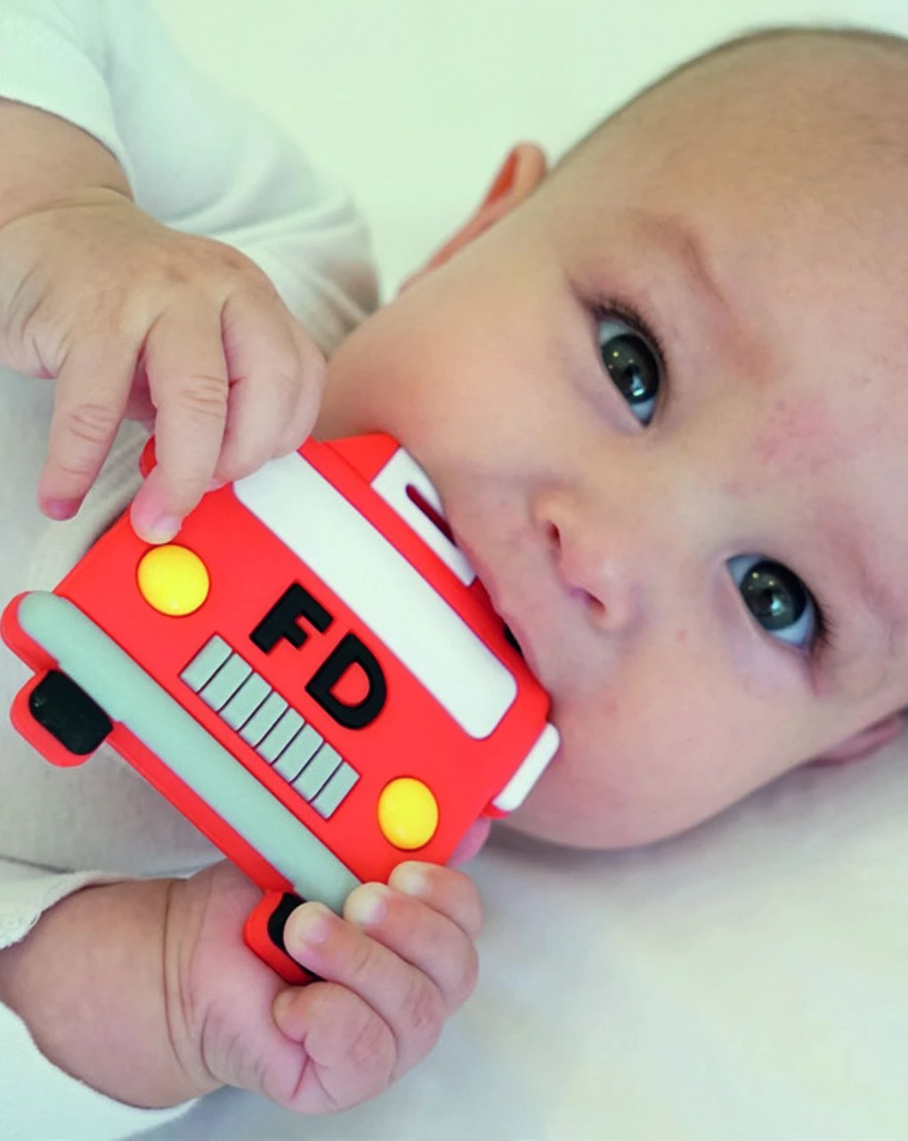 Massaggiagengive in silicone a forma di camioncino dei pompieri.