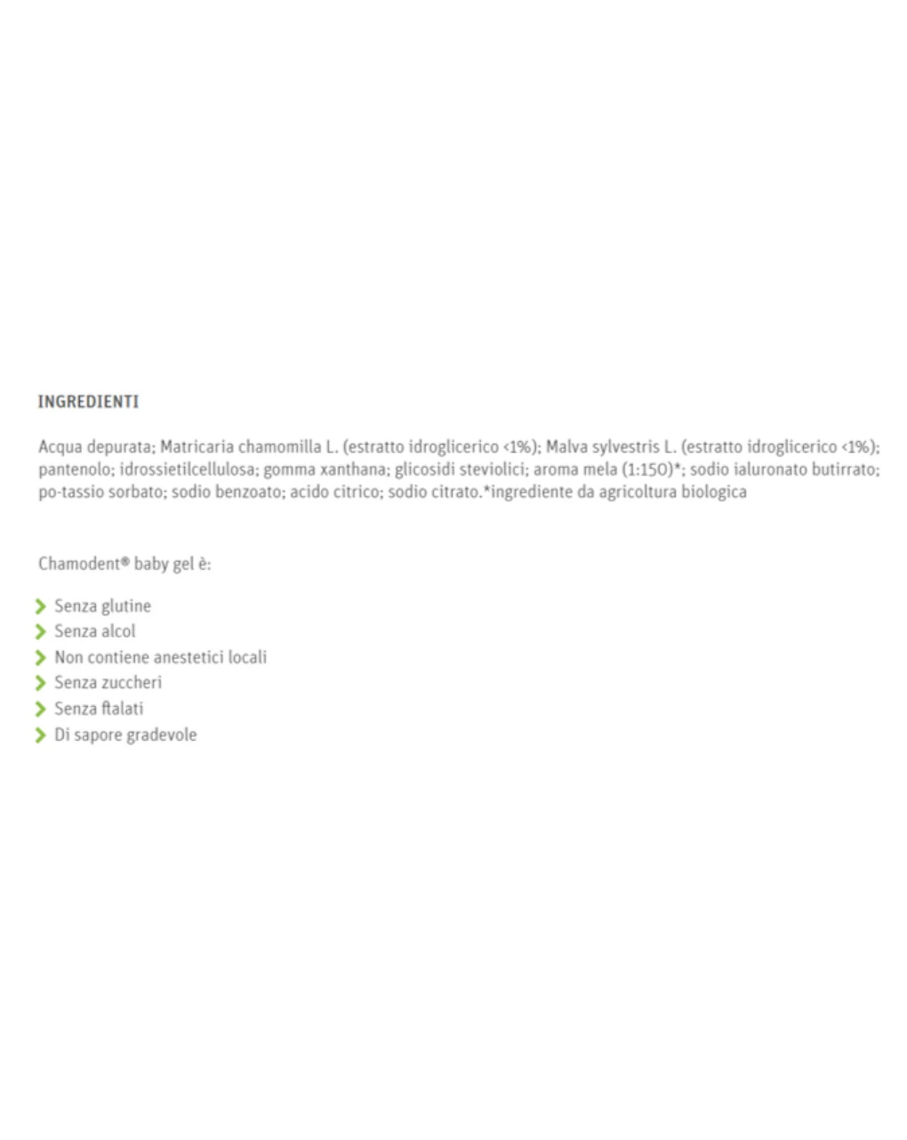 Chamodent baby gel è un prodotto che grazie alle sue caratteristicheprotegge la gengiva gonfia, irritata e arrossata dal fastidio provocato dalla nascita dei primi denti. Chamodent baby gel crea un film sulla gengiva, proteggendola.