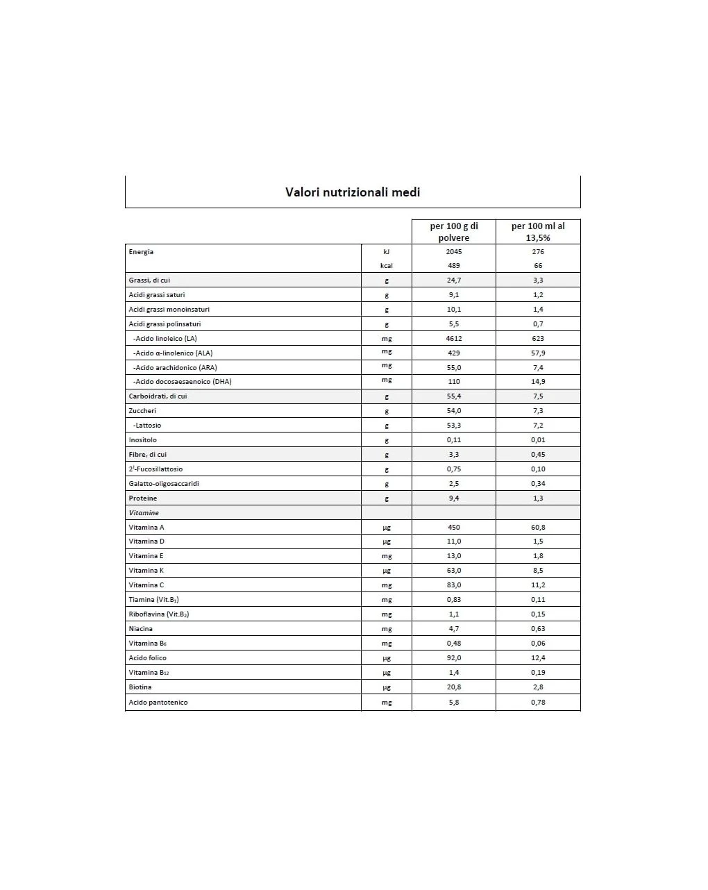 Ricostituzione: 1 misurino raso e non pressato ogni 30 ml di acqua, meglio se minimamente mineralizzata come Humana Amorosa. Humana 1 si ricostituisce al 13,5%. Il misurino raso contiene circa 4,5 g di polvere.