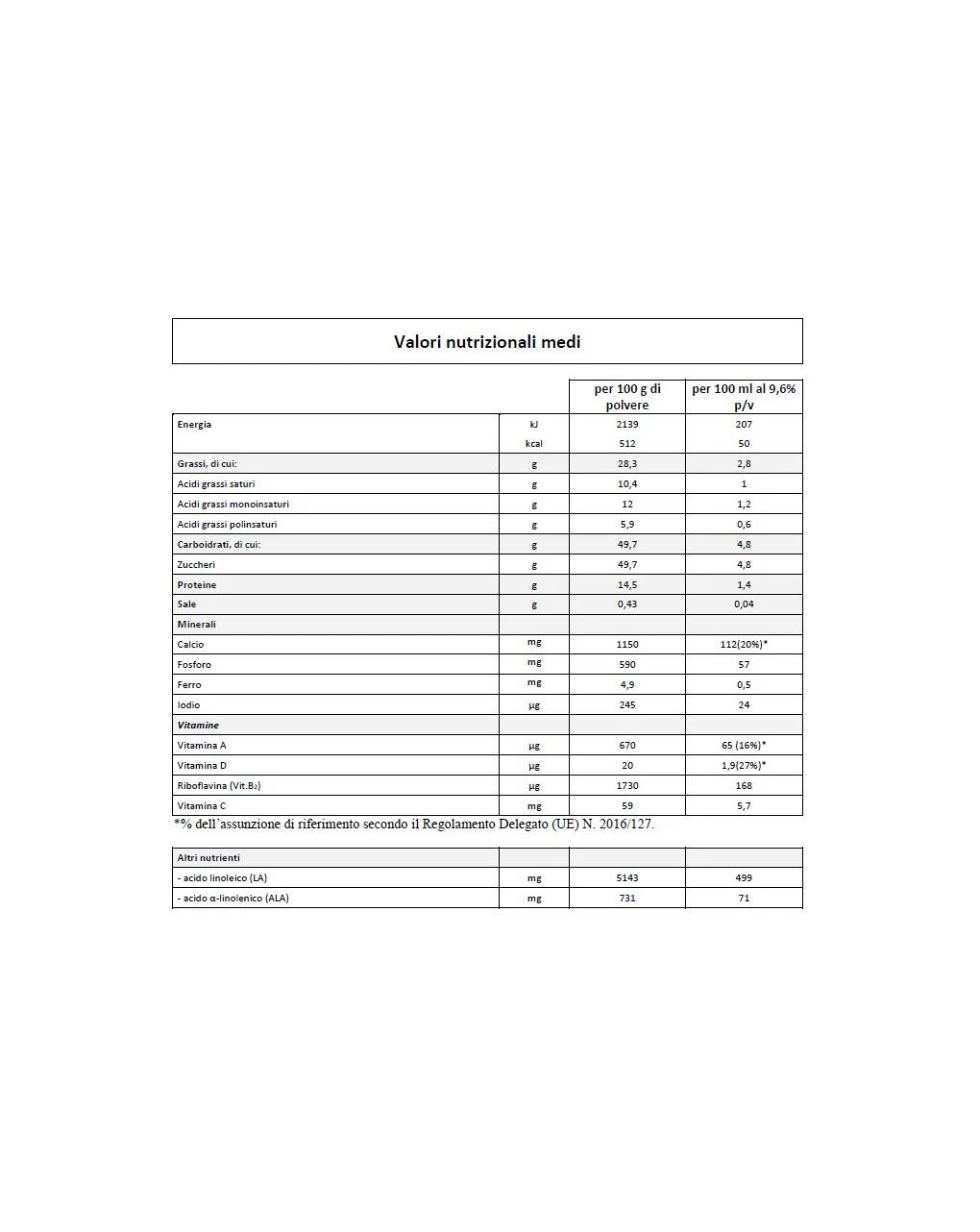 Latte scremato, lattosio, oli vegetali (palma, colza, girasole), calcio carbonato, sali di calcio dell’acido ortofosforico, vitamine (vitamina C, riboflavina, vitamina A, vitamina D3), solfato ferroso, stabilizzante: acido L(+) – lattico, potassio iodato.