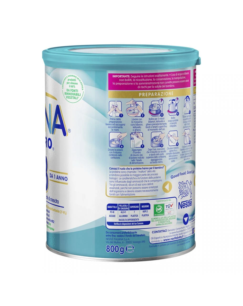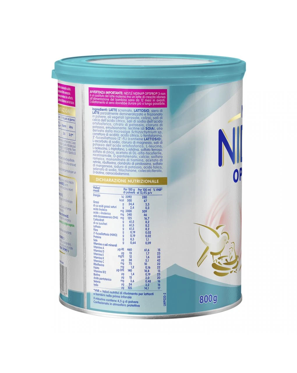 AVVERTENZA IMPORTANTE: NESTLÉ NIDINA OPTIPRO 3 non è un sostituto del latte materno ma un latte di crescita idoneo all’alimentazione del bambino sano da 12 mesi in avanti. L’allattamento al seno dovrebbe durare più a lungo possibile.