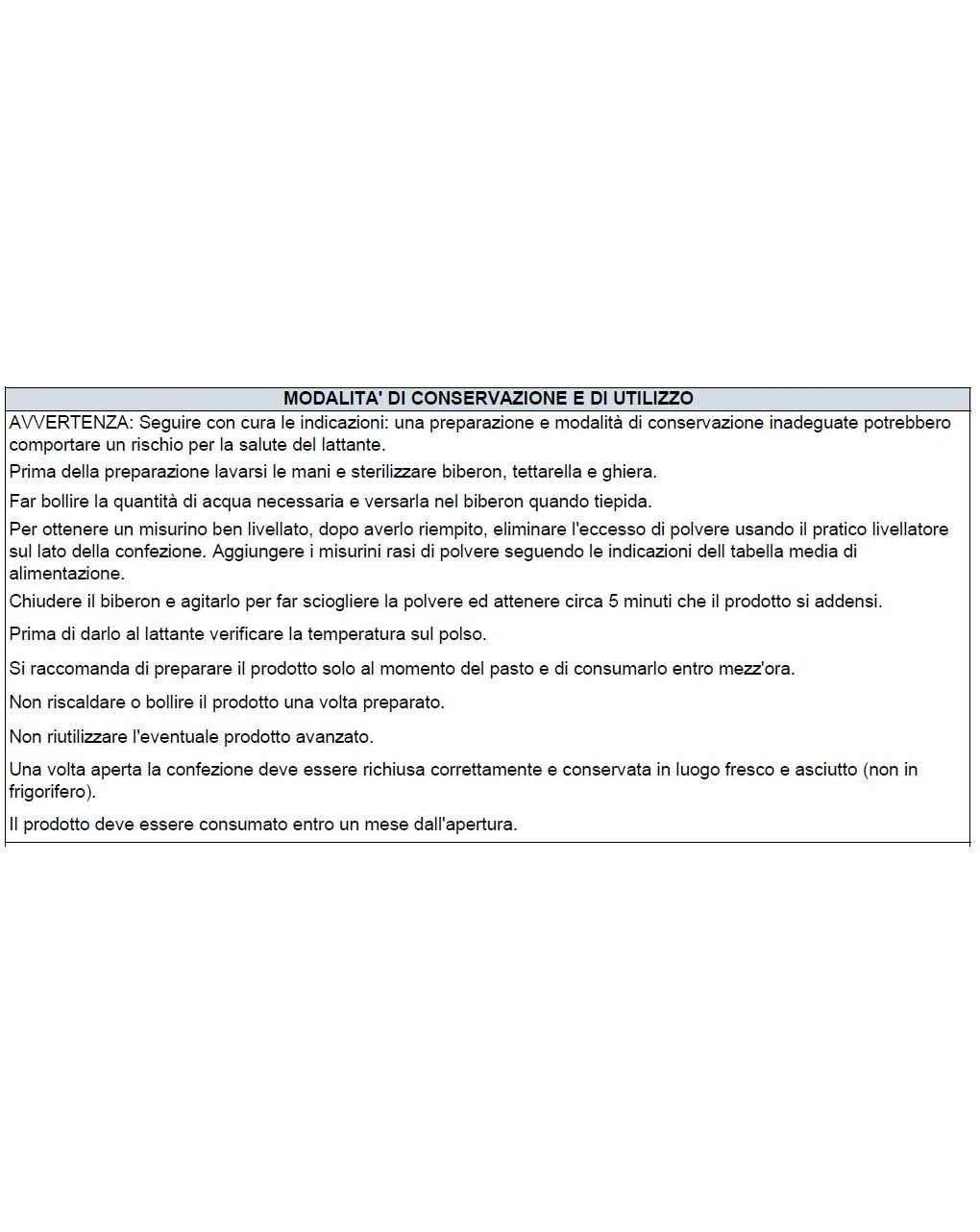 Il prodotto deve essere utilizzato sotto il controllo del Pediatra. Il prodotto è indicato per lattanti dal sesto mese al dodicesimo mese di vita e non può essere utilizzato come unica fonte di nutrimento. Il prodotto non deve essere utilizzato per via parenterale. Non idoneo a lattanti prematuri. Importante: Il latte materno è l’alimento ideale per il lattante e dovrebbe essere favorito e utilizzato fino a quando possibile.