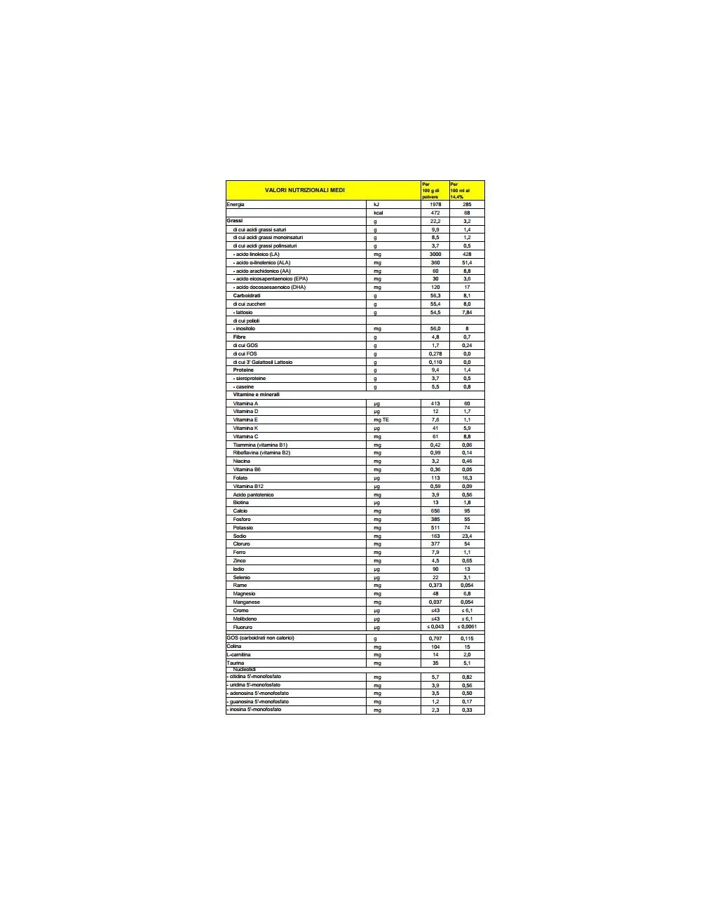Lattosio, oli vegetali (palma, cocco, colza a basso contenuto di acido erucico, girasole), latte scremato in polvere, siero di latte demineralizzato (in polvere), galatto-oligosaccaridi da latte (in polvere), addensante: farina di semi di carruba, concentrato di sieroproteine da latte, fosfato di calcio, sieroproteine da latte (in polvere), olio di pesce, frutto-oligosaccaridi, citrato di sodio, cloruro di magnesio, carbonato di calcio, citrato di potassio, cloruro di potassio, cloruro di colina, olio estratto da Mortierella alpina , acido L-ascorbico, emulsionante: lecitina di soia, inositolo, taurina, solfato ferroso, L-triptofano, solfato di zinco, sodio L-ascorbato, L-carnitina, citidina 5′-monofosfato, acetato di DL-α-tocoferile, uridina 5′-monofosfato