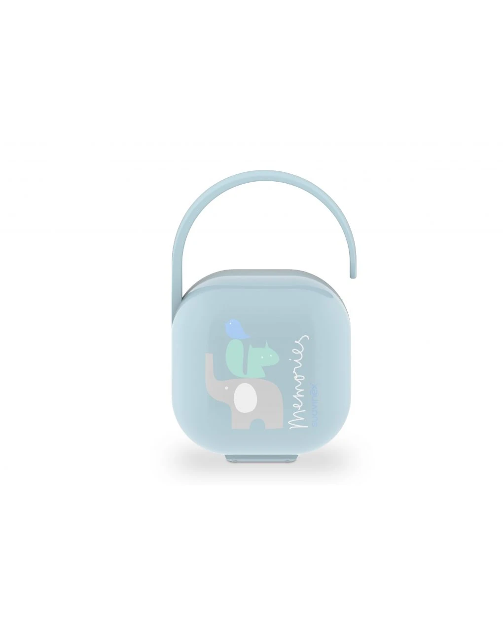 MEMORIES SCATOLA PORTASUCCHIETTO AZZURRO ha un manico flessibile per appenderlo al passeggino, alla borsa o alla culla. Presenta una simpatica decorazione sul fronte.