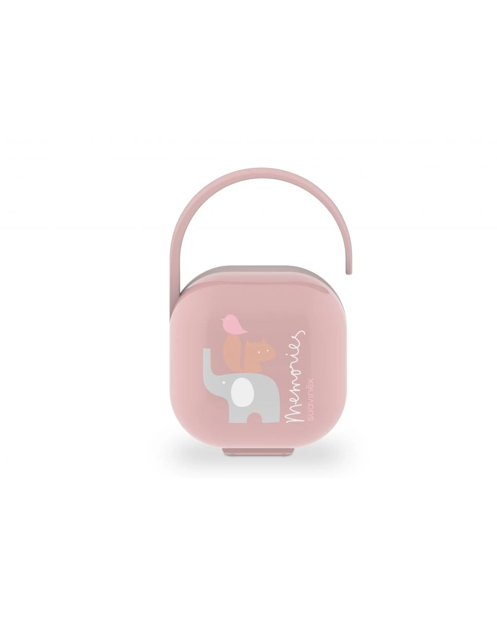 MEMORIES SCATOLA PORTASUCCHIETTO ROSA ha un manico flessibile per appenderlo al passeggino, alla borsa o alla culla. Presenta una simpatica decorazione sul fronte.