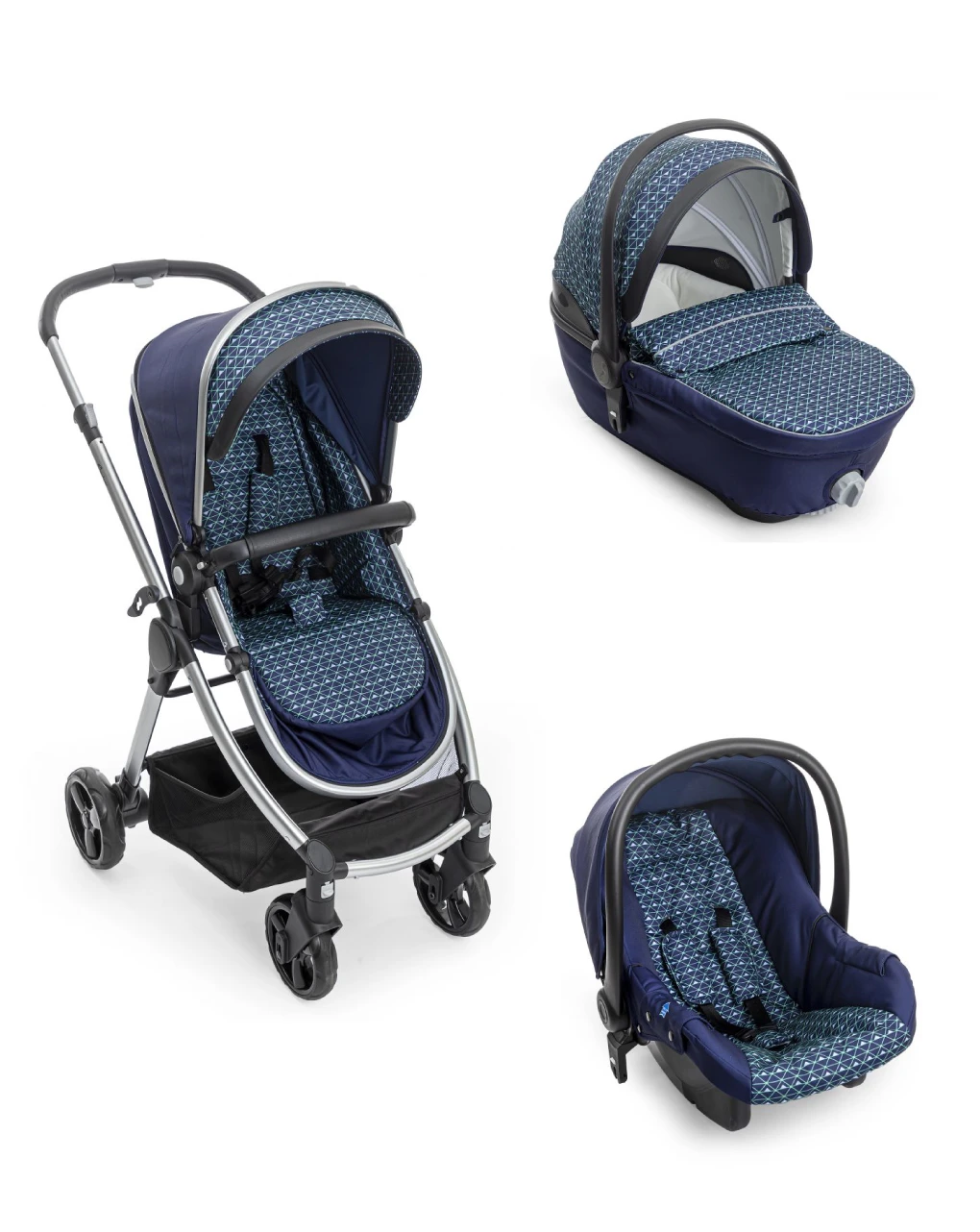 Chiuso è molto compatto e sta in piedi da solo! Con struttura in alluminio, maniglione unito in ecopelle regolabile in altezza e chiusura a libro. Ruote anteriori singole piroettanti, ruote posteriori più grandi con sospensioni e freno. Il seggiolino auto (omologato 0, fino a 10 kg di peso) si aggancia con le cinture a 3 punti dell’auto, navicella omologata auto fino a 10 kg con kit auto incluso, prese d’aria sulla capote e schienalino reclinabile. Il passeggino si trasforma in versione nanna. Accessori inclusi: borsa coordinata, coprigambe navicella, capote regolabile con aerazione, cestello portaoggetti, kit auto e 2 miniriduttori double face per passeggino e seggiolino auto. Pesi utili ai genitori: Navicella kg 5; passeggino kg 8.8; seggiolino kg 3.2. Dimensioni del passeggino: aperto 86x60x107 cm; chiuso 78.5×60 cm. Venduto separatamente: materassino universale per navicella 69×30 cm.