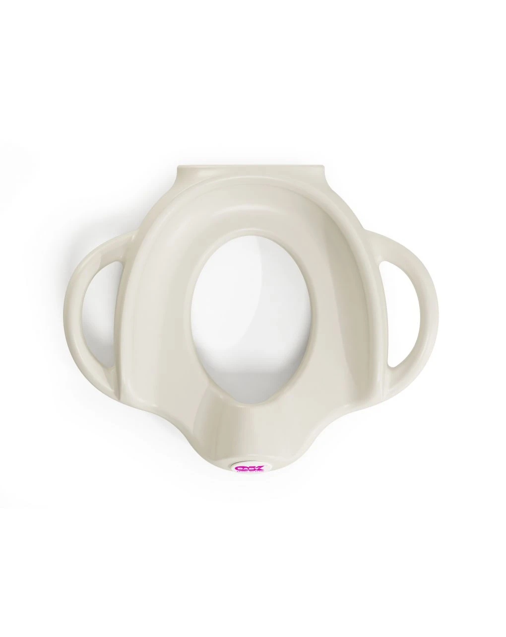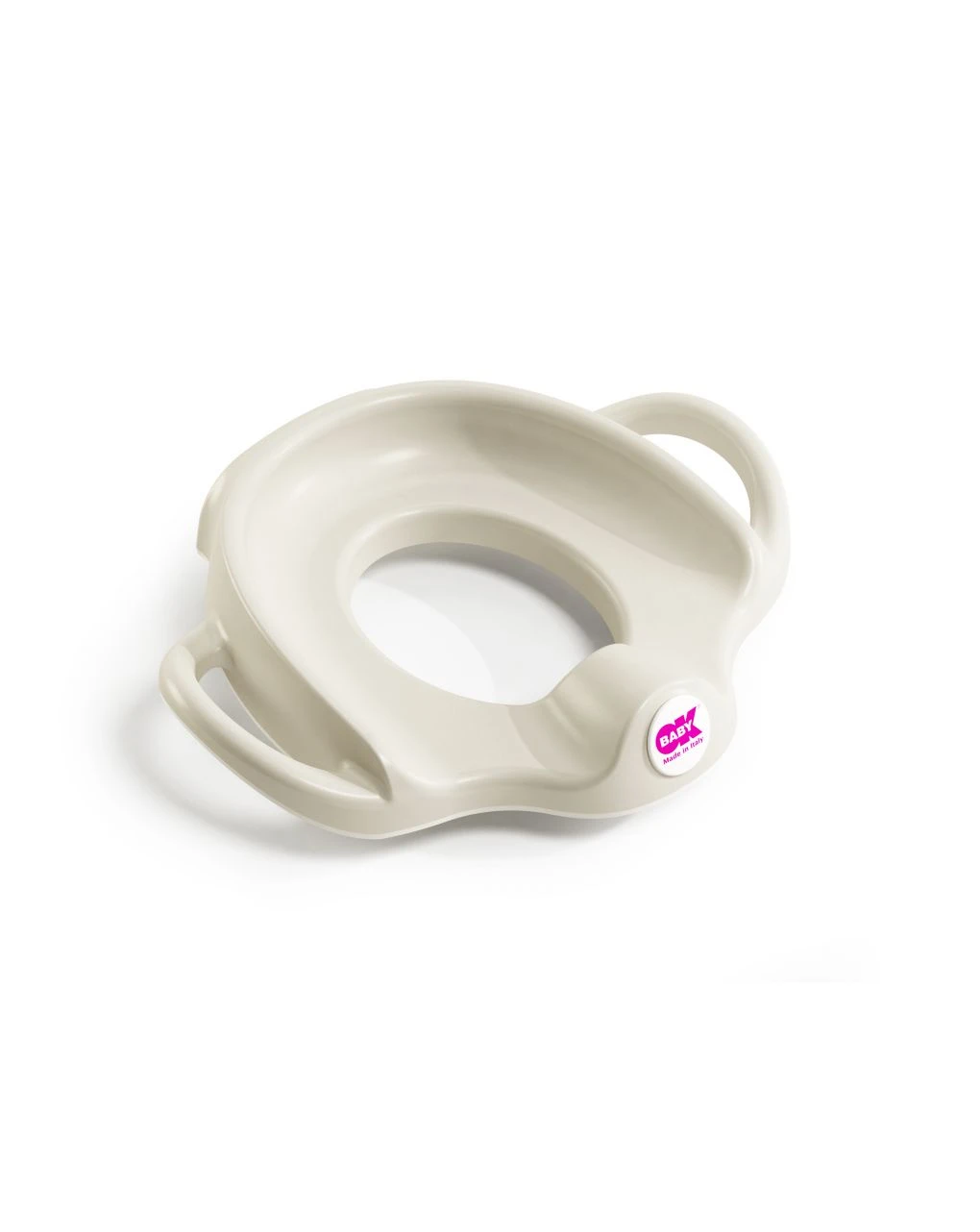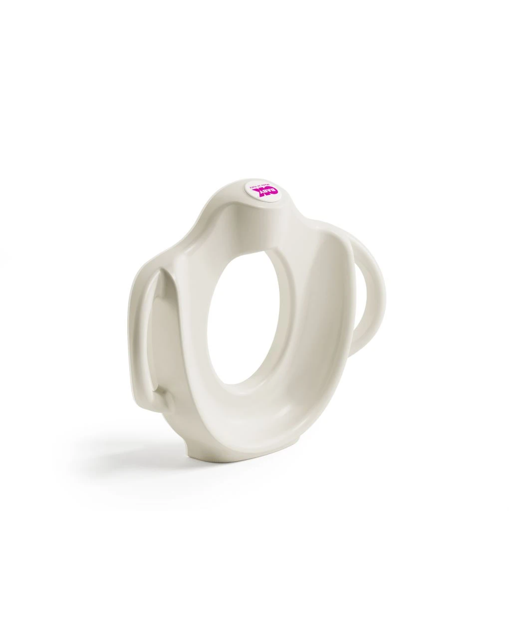 Pratico riduttore wc, con schienale alto e maniglie per un comodo appoggio del bimbo. Bordo antiscivolo per una perfetta aderenza al wc .
