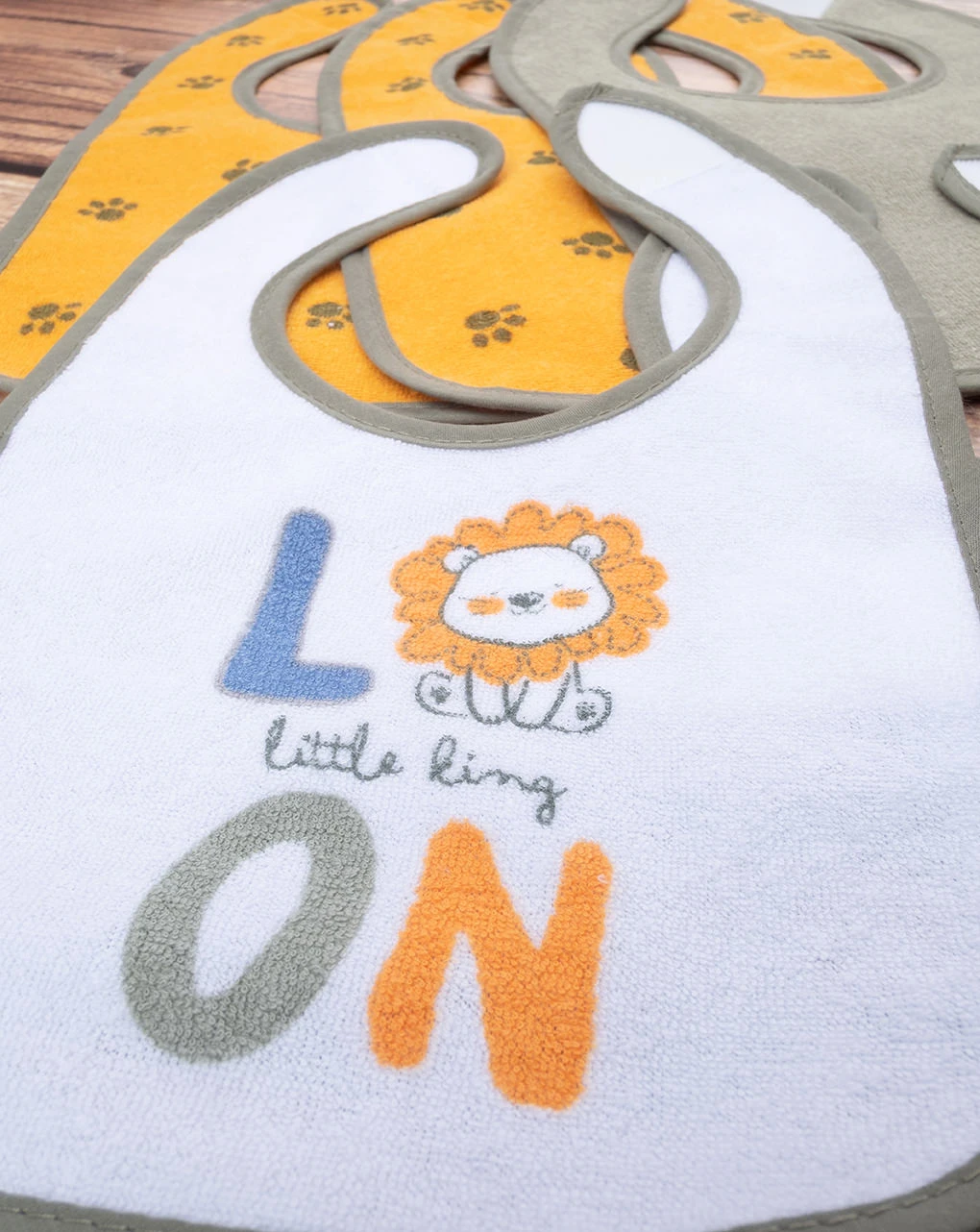 Simpatico pack 5 bavaglini piccoli in spugna da bambino in 100% cotone. I capi si sviluppano in varie tonalità quali bianco, giallo ocra e verde militare e con differenti e stilizzate stampe “Leone” in tinta coordinata. La vestizione è pratica e sicura grazie a bottone automatico sul girocollo. Accessori non in vendita. La confezione contiene solo il capo d’abbigliamento