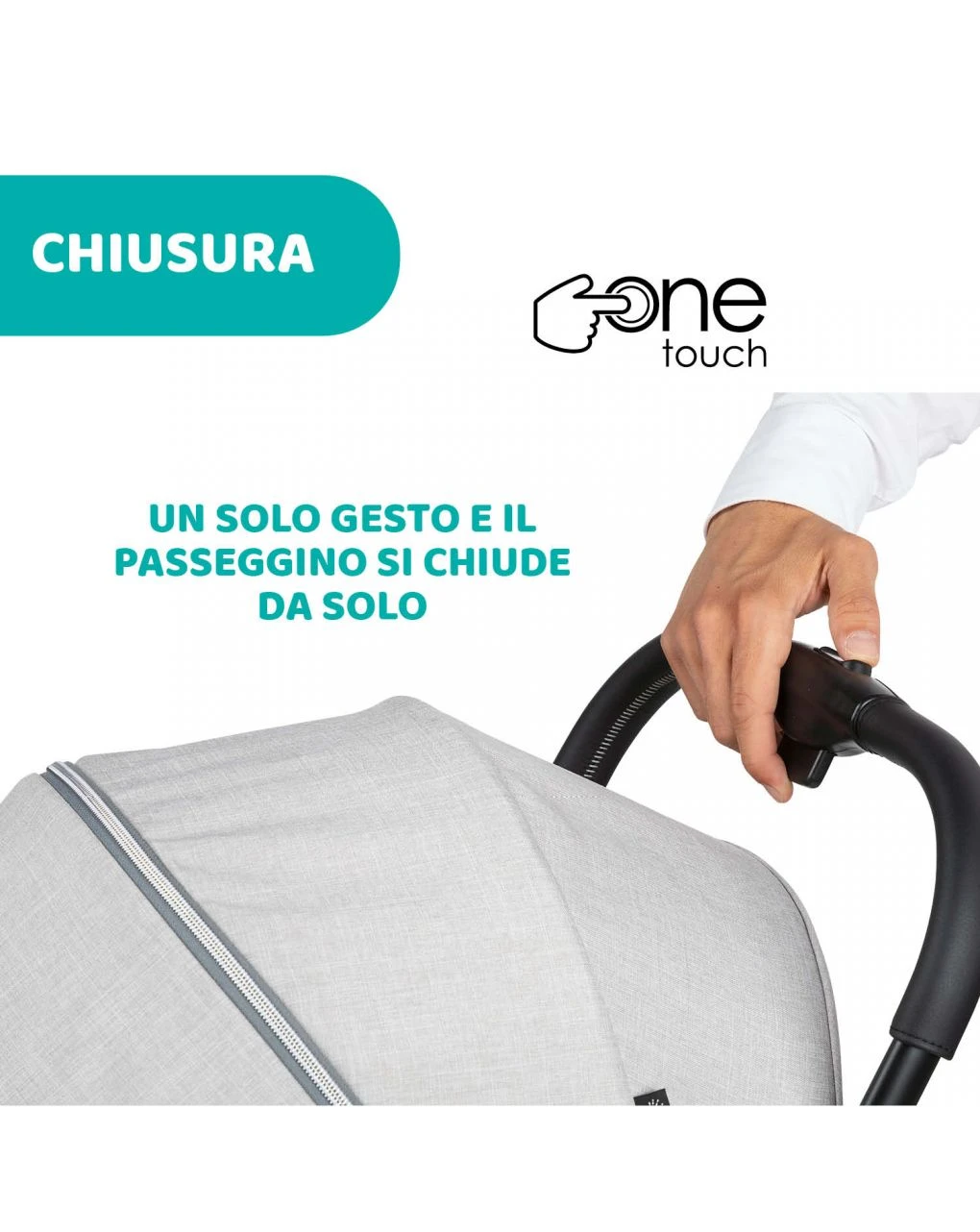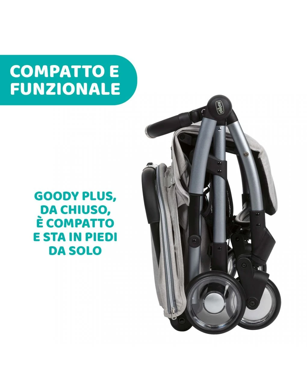 Il passeggino Goody Plus è stato ideato da Chicco per essere straordinariamente pratico e maneggevole. Basta premere il pulsante presente nel maniglione e il passeggino si chiude da solo, risultando incredibilmente compatto. Goody Plus accompagnerà il tuo bambino dalla nascita sino ai 4 anni di età. Infatti la seduta ampia e lo schienale regolabile in 3 diverse posizioni e il poggiagambe, garantisce sempre il massimo del comfort e del relax, mentre la barra di protezione frontale e il paracolpi assicurano protezione al piccolo. E con la cappottina con inserto estraibile e trattamento waterproof e UV+50, il tuo bimbo sarà sempre protetto. Grazie ai dettagli in prezioso materiale rivestito e alle cuciture in contrasto, i tubi anodizzati e le ruote trasparenti in policarbonato il passeggino Goody Plus rappresenta un mix perfetto di comodità, tecnologia e design di qualità, un sistema modulare completo che si combina alla perfezione con la navicella morbida e seggioloni auto Kiros e Kaily della linea Chicco.