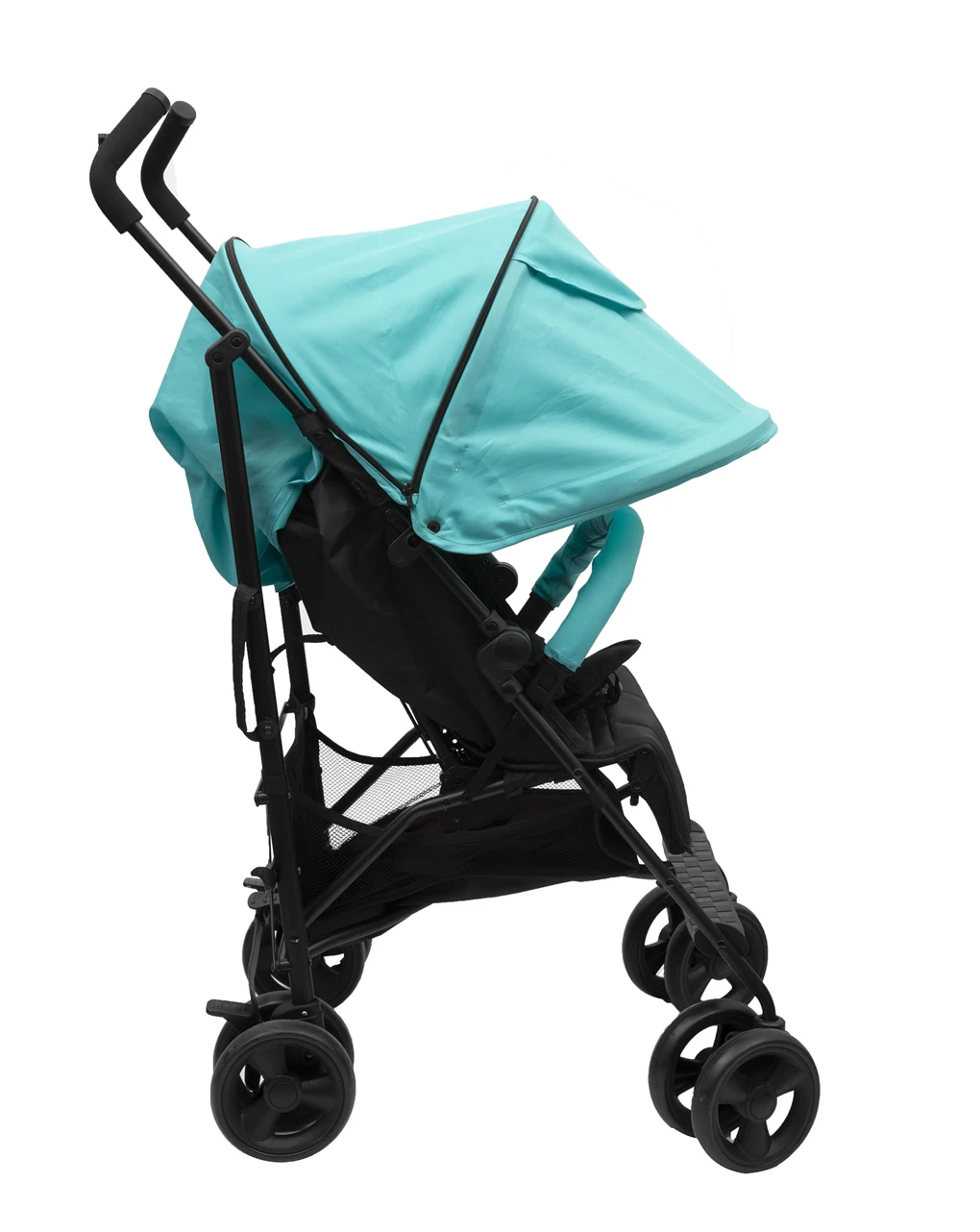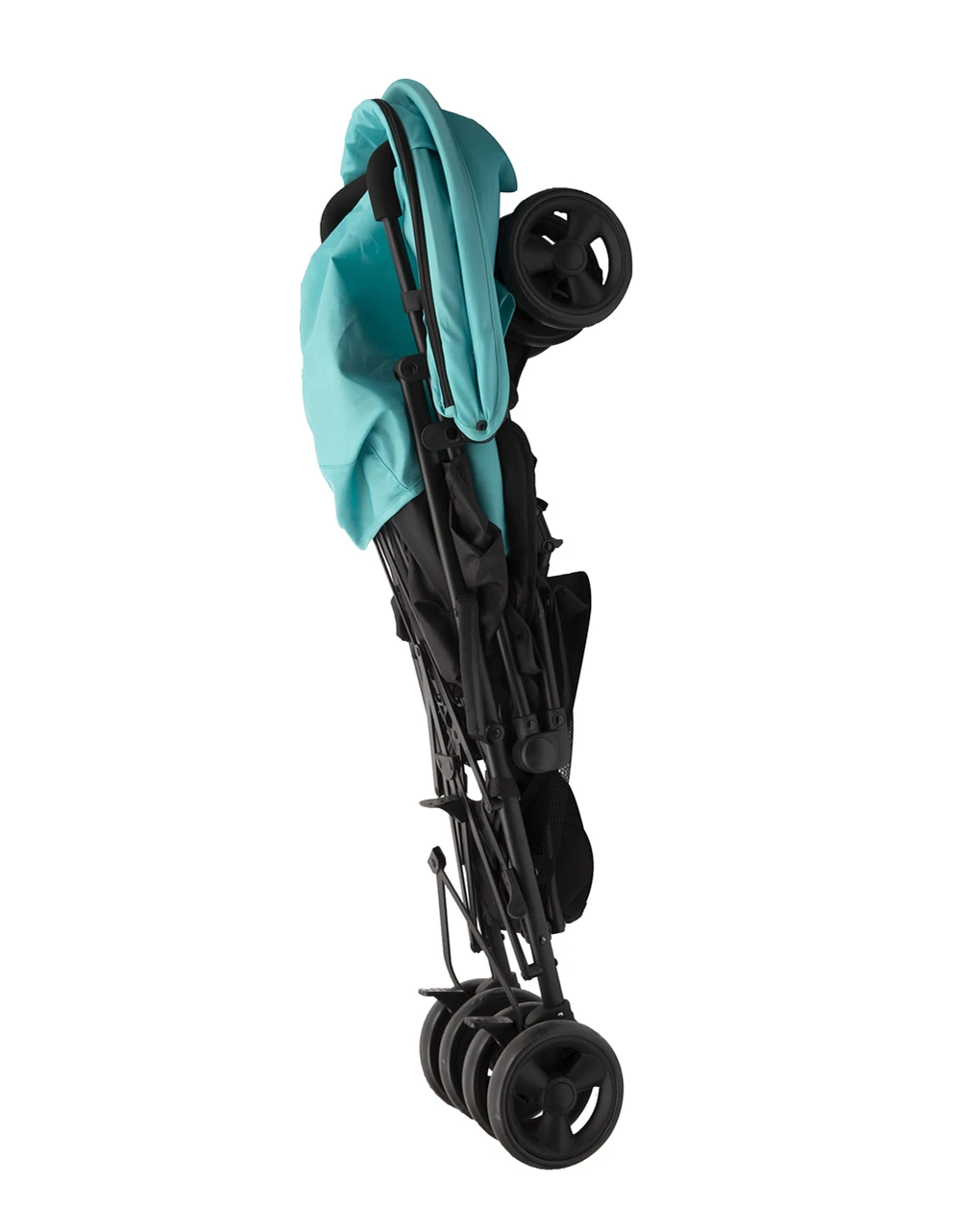 - Passeggino con struttura in acciaio, chiusura a ombrello e impugnatura a manici singoli.