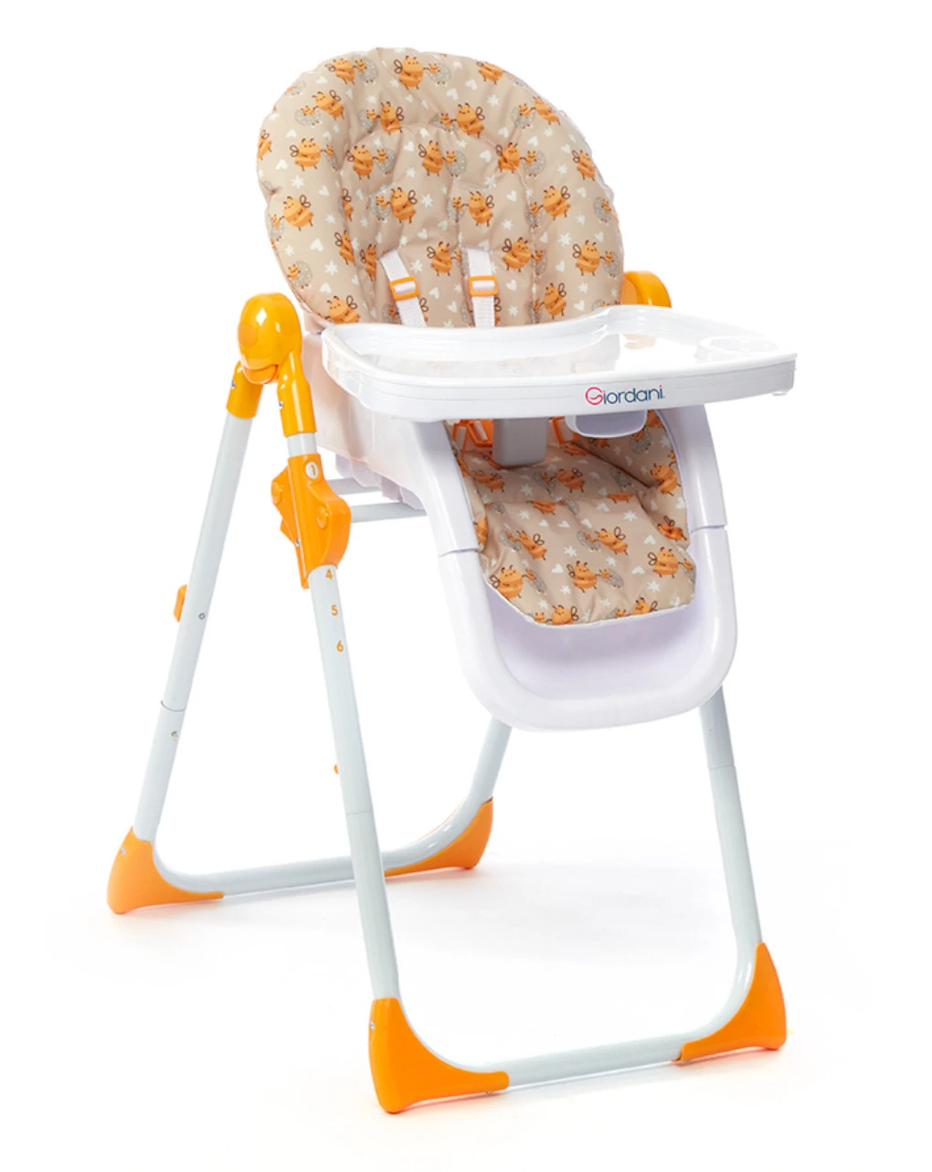 Seggiolone utilizzabile da 6 mesi più. Chiusura a libro schienale regolabile in 3 posizioni, altezza seduta regolabile in 6 posizioni, cintura a 5 punti vassoio removibile. Ampio cestello per i giochi.