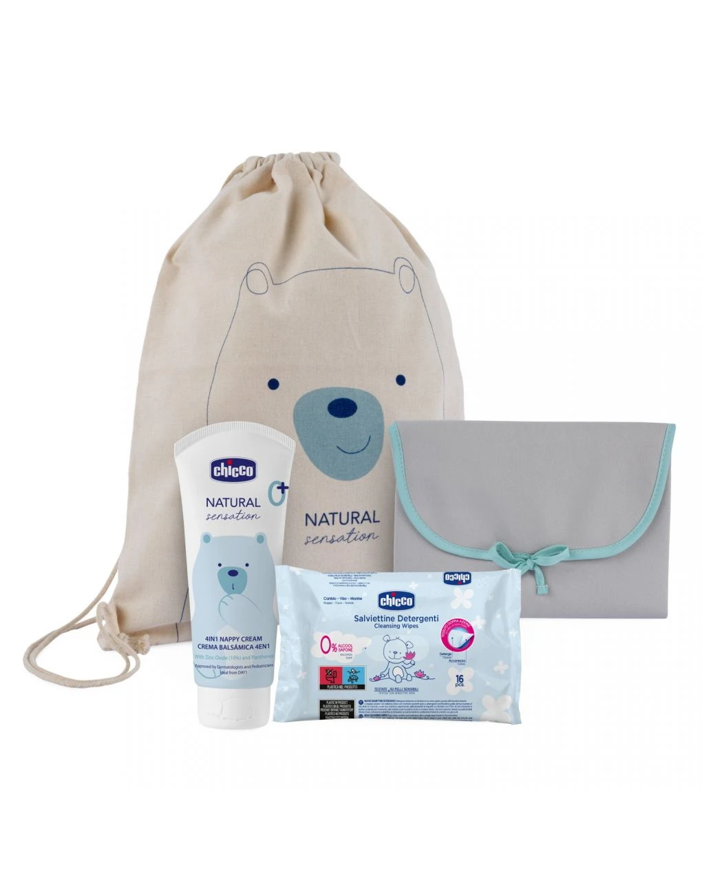 - Comprende una borsa in cotone 100%, un fasciatoio, un flacone di pasta lenitiva 100 ml Natural Sensation, salviette detergenti 16 pezzi.